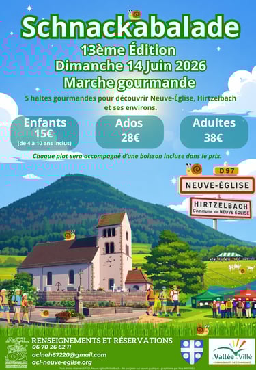 Vous l'attendiez... La voici ! Rendez-vous le 14 Juin 2026 à la salle des fêtes de Neuve-Eglise pour le départ de la 13eme édition de la Schnackabalade. Les réservations sont d'ores et déjà ouvertes ! Rendez-vous sur la page https://acl-neuve-eglise.org/schnackabalade-2026#reservations, le bouton ci-dessous ou le bouton de téléchargement du bulletin d'inscription.