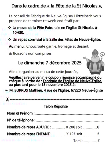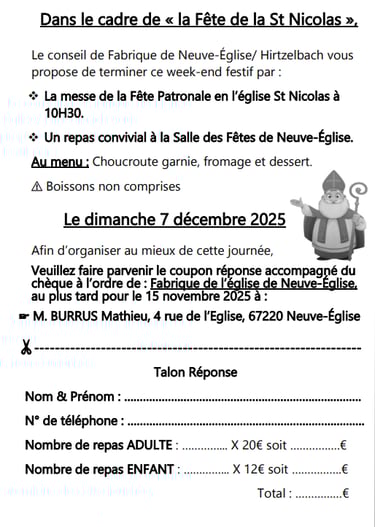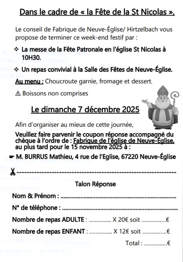 De plus, le conseil de fabrique de l'eglise St Nicolas vous propose une choucroute garnie à la salle des fêtes de Neuve-Eglise. Prix de 20€ pour les adultes et 12€ pour les enfants.
