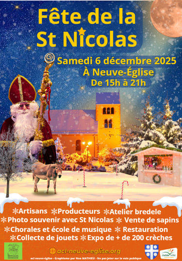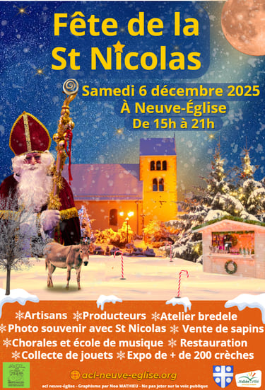 La fête de la St Nicolas est organisée par l'A.C.L Neuve-Eglise. Cette fête est accessible à tous sans réservations.