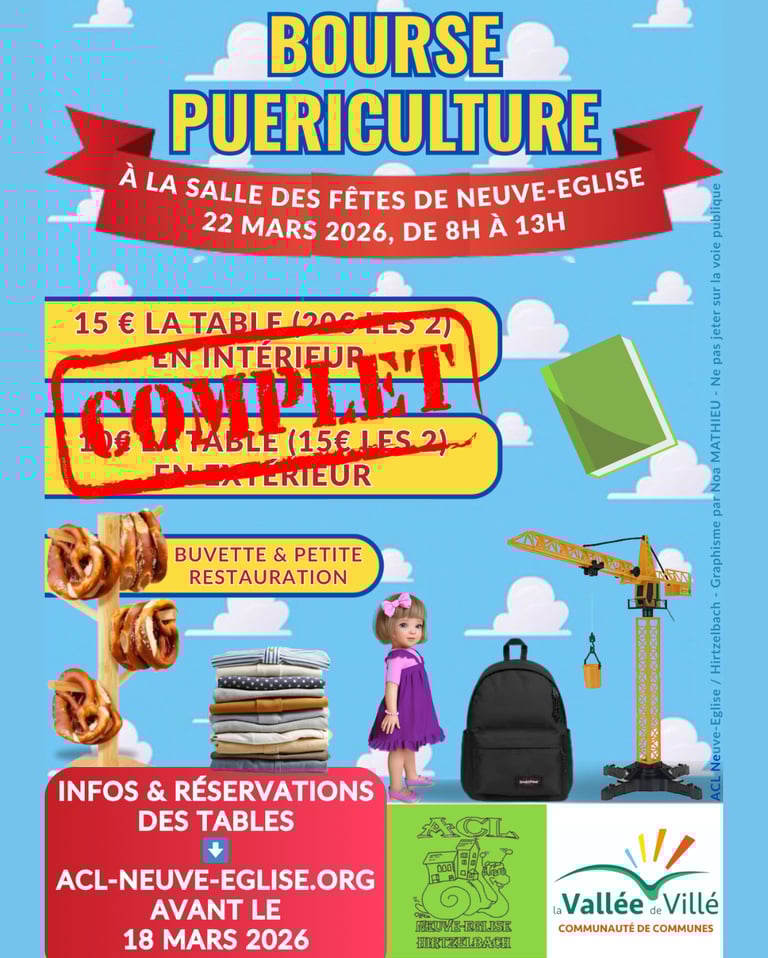 BOURSE PUÉRICULTURE – NEUVE-ÉGLISE 💥 C’est COMPLET ! La salle est désormais complète avec 34 tables réservées ! 👉 Toutes les inscriptions sont officiellement clôturées. Un grand merci pour votre enthousiasme ! Maintenant, place à la bourse… et nous avons hâte de vous retrouver nombreux ! 👶 Vêtements enfants 🧸 Jouets / livres 📚 🍼 Matériel de puériculture 🎒 Accessoires et bonnes affaires Des dizaines de stands vous attendent pour faire de super trouvailles à petits prix ! 🐣 Et avec les fêtes de Pâques qui arrivent bientôt, ce sera aussi l’occasion de trouver de belles idées cadeaux pour les enfants ! 📅 Dimanche 22 mars 2026 🕗 De 8h à 13h 📍 Salle des fêtes de Neuve-Église 🍴 Buvette & petite restauration sur place 👉 Parents, futurs parents, grands-parents… Venez chiner, vous faire plaisir et dénicher de belles affaires pour vos enfants ! On vous attend nombreux pour cette belle matinée conviviale 😊